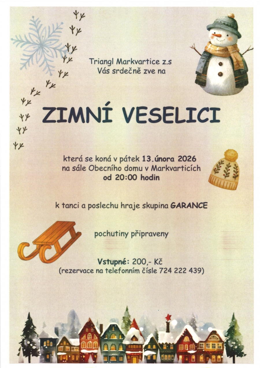 Srdečně vás zveme na Zimní veselici, která se bude konat v pátek 13. února 2026 na sále Obecního domu. Hraje skupina Garance.